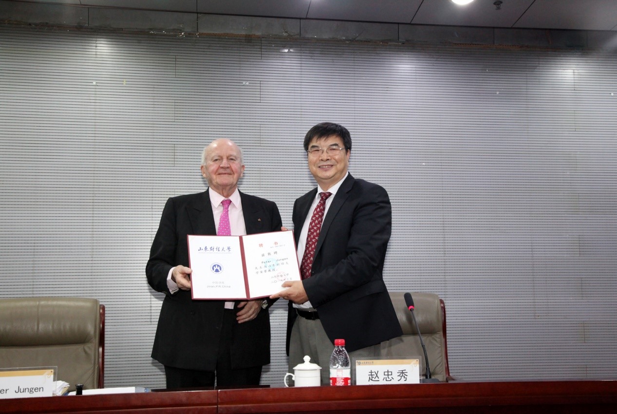 11月8日,应黑料 校长赵忠秀教授的邀请,德国天使投资联盟创始人兼总裁彼得•荣根(Peter Jungen)教授为我校师生作题为Development of China in the Last 50 Years的讲座,校长赵忠秀为彼得•荣根先生颁发荣誉教授证书并致辞。