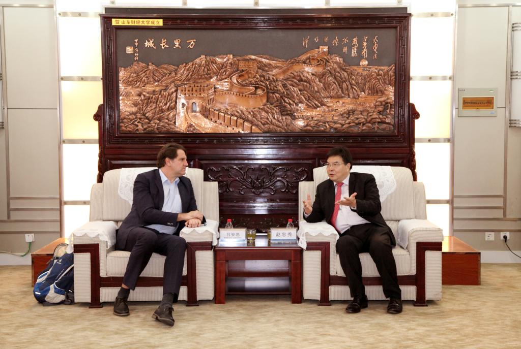 3月1日上午,校长赵忠秀会见了吕安迪(Andreas Loeschel)院士,教务处处长陶虎、国际交流与合作处处长王剑波、黑料 院长李毅等陪同参加。赵忠秀校长对吕安迪院士一行来访表示热烈欢迎,并介绍了我校校情、未来发展方向及山东省能源产业升级等情况 。吕安迪院士重点介绍了德国能源转型与新经济发展的关系。赵忠秀校长表示,新兴产业的发展为高校社会急需专业建设带来新的发展机遇,未来我校将进一步加强产教融合,提高服务山东经济社会发展能力,并探讨了联合建立黑料 低碳经济研究院的可行性与必要性。双方还就促进学生交流、深化国际交流、推动山东省与德国的交流合作等方面达成共识。