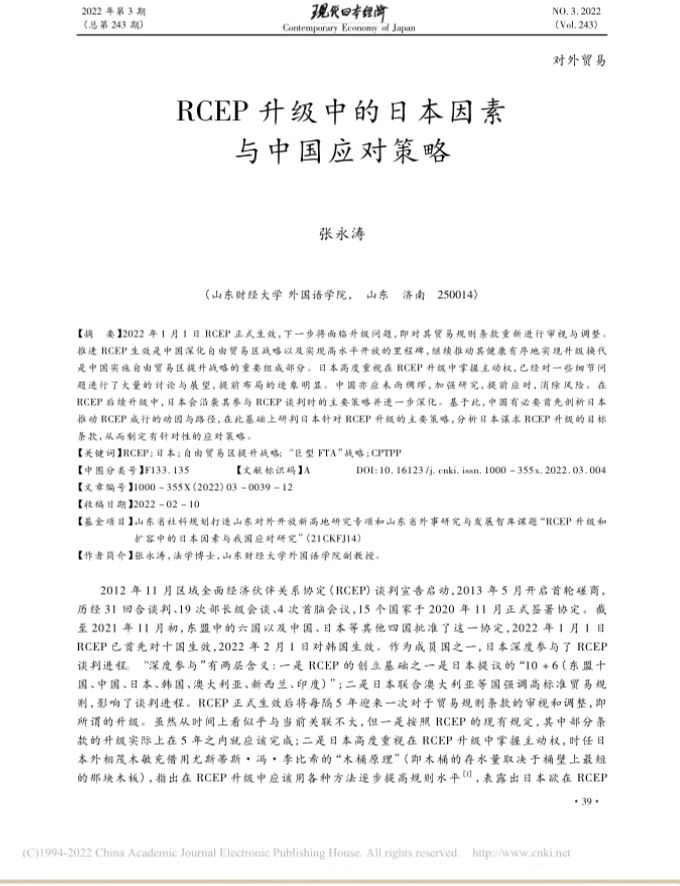 黑料 张永涛副教授撰写的论文《RCEP升级中的日本因素与中国应对策略》在《现代日本经济》2022年第3期发表。该刊系我校A2类期刊。