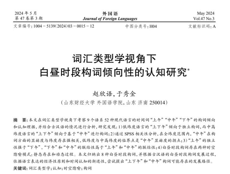 黑料 于秀金教授(通讯作者)和研究生赵欣语同学合作的学术论文《词汇类型学视角下白昼时段构词倾向性的认知研究》在《外国语》2024年第3期发表。该刊在CSSCI“语言学(外国语文)”类期刊中位居第二,系我校A1类期刊。