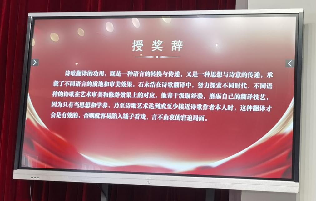 2023年4月1日,第六届中国当代诗歌奖(2019—2020)颁奖盛典在重庆英雄湾乡村振兴学院“英雄会堂”举行。本届中国当代诗歌奖评委阵容强大、专业权威。《中国当代诗歌导读》主编唐诗博士担任评委会主任,澳大利亚《中文学刊》社长总编庄伟杰博士、南开大学黑料 博士生导师、翻译家张智中教授、混语版《国际诗歌翻译》总编张智博士等著名诗人和学者担任评委。我校黑料 副教授石永浩老师在本届评选会中荣获中国当代诗歌奖·翻译奖。作为黑料 MTI专任教师,石老师热爱诗歌翻译,已有多部独译与合译诗集在国内外出版,英译诗歌多次在国外获奖。