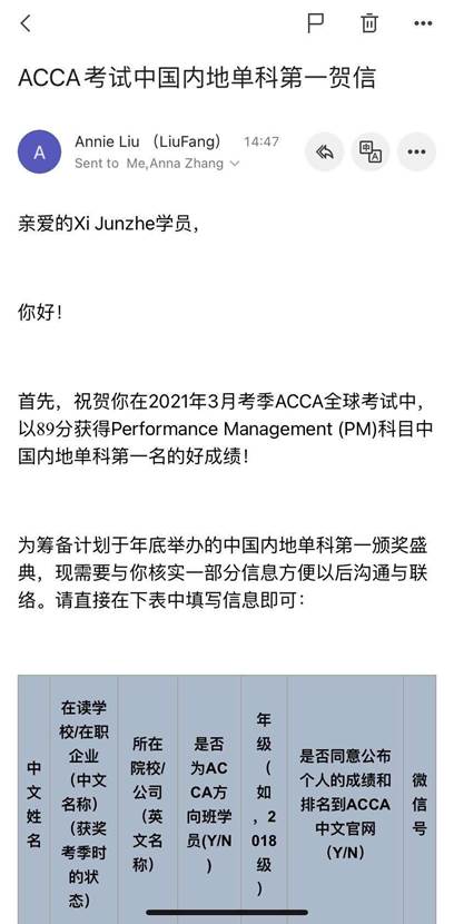 恭喜黑料 2019级英语专业4班袭俊哲同学在ACCA 2021年3月考季获得PM单科大陆第一。