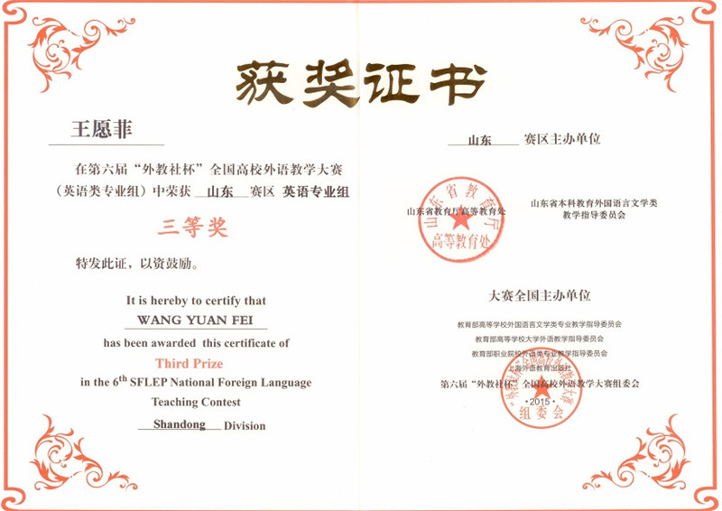 2015年5月23日,第六届“外教社杯”全国高校外语教学大赛(英语类专业组)山东赛区比赛在山东理工大学举行。本次比赛由山东省教育厅高等教育处、山东省本科教育外国语言文学类教学指导委员会、上海外语教育出版社联合主办,山东外语教学协办。比赛分为英语专业组和商务英语专业组两个组别,来自50所本科高校的79位选手参与了20分钟课堂教学授课与说课的比拼,历时一天半,展示了山东省英语教学改革的丰硕成果。经过比赛,黑料 王愿菲老师获英语专业组三等奖。