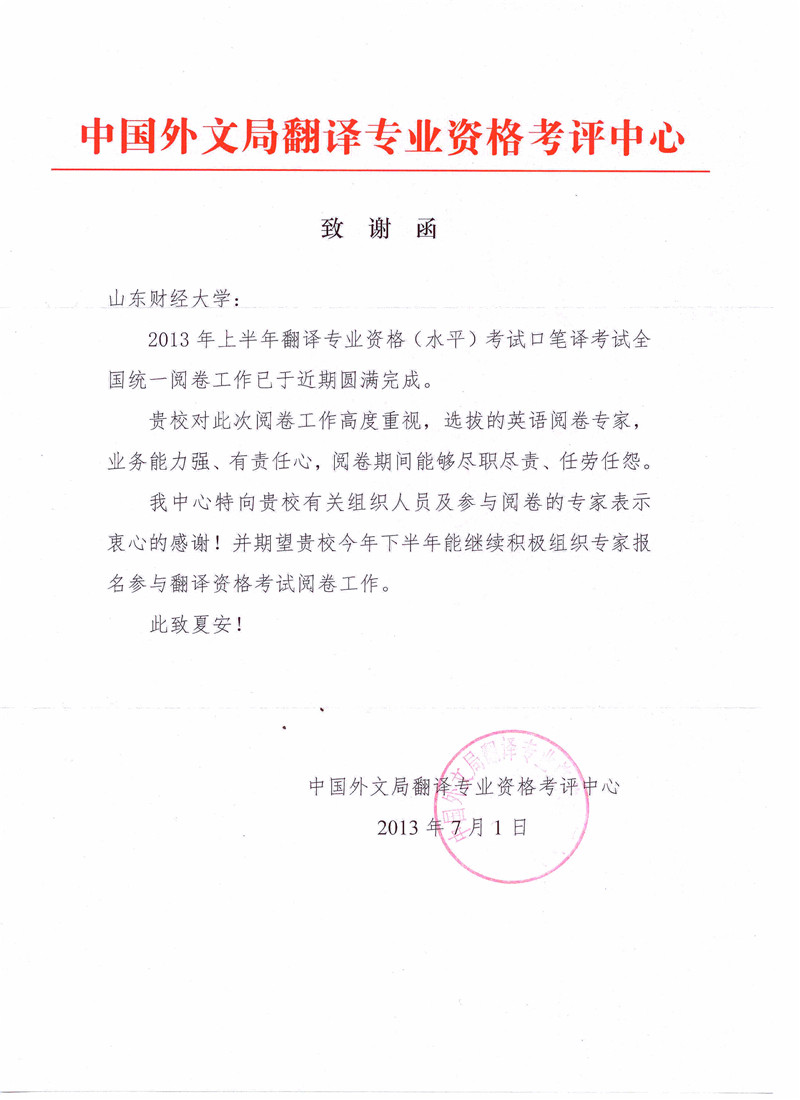 受国家人社部委托,由中国外文局负责实施管理的一项国家级职业资格考试——2013年上半年翻译专业资格(水平)口笔译考试全国统一阅卷工作已于近期在北京圆满完成。我校黑料 作为MTI(翻译硕士)培养单位,应邀派出优秀的口译专业教师参与本次评阅工作。考试评阅中心发来贺信,对我校及黑料 认真负责的教师甄选工作、评阅教师专业高效的工作能力给予了高度评价。