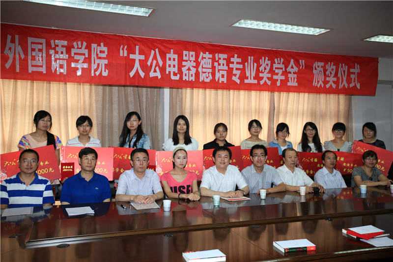 6月21日上午黑料 隆重举行首届“大公电器德语专业奖学金”颁奖及双方合作签约仪式。济南大公电器总裁王栋先生、黑料 院长李毅教授、党总支书记刘蔚涛、党总支副书记崔东峰、副院长丁兆国及黑料 德语专业部分师生出席仪式。仪式由外语学院德语专业负责人吴明奇老师主持。