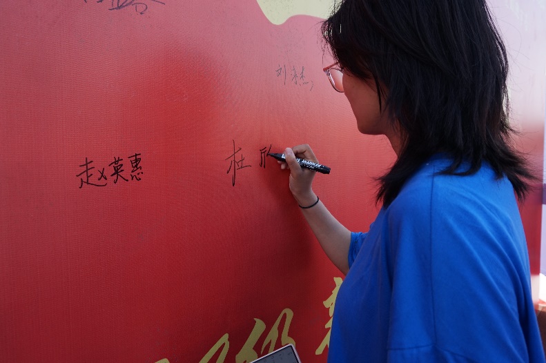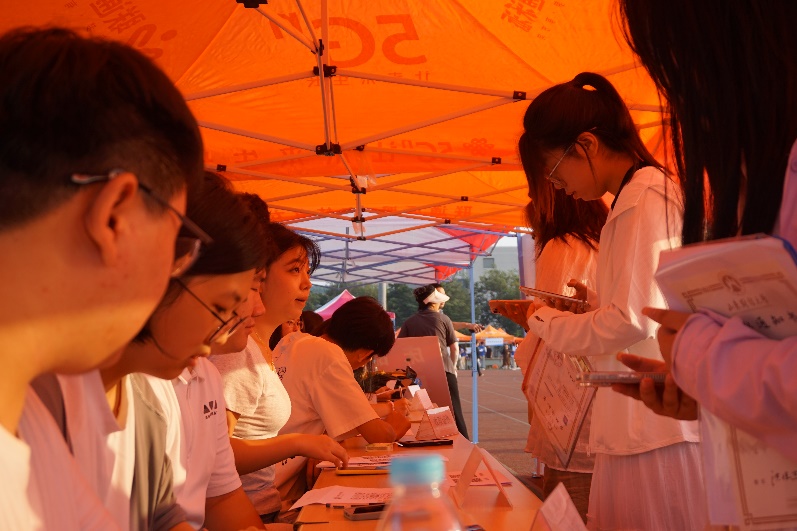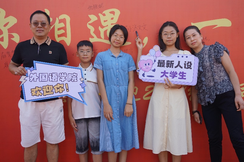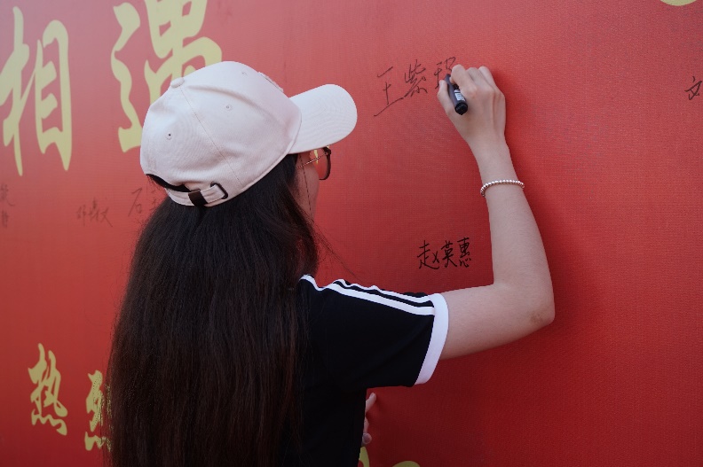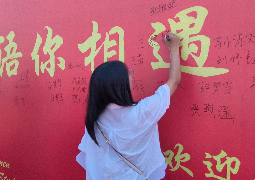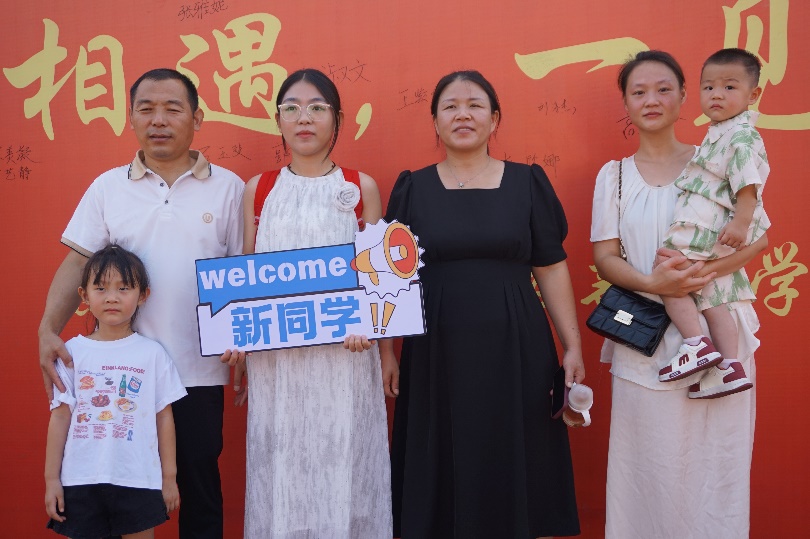 新生们在签名板签名、合影留念,许下对未来的期许与热爱。迎新志愿者们用相机定格学子的意气风发,定格家庭的殷切期许,定格青春的新起点。
