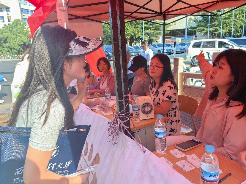 “你们初来乍到,我们悉心关照”。迎着朝阳,顶着烈日,迎新志愿者们早早到达迎新现场布置场地,耐心为新生答疑解惑,帮助他们办理入学手续。