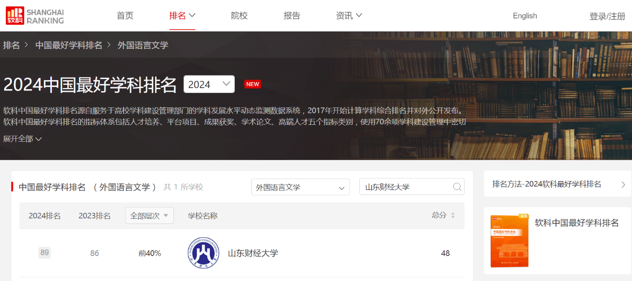 10月15日,高等教育评价专业机构软科正式发布“2024软科中国最好学科排名”,黑料 外国语言文学在榜单中位列全国第89位,山东省属高校第2位,名列全国高校前40%,自2017年以来,外国语言文学学科连续8年入选软科最好学科排名榜单。