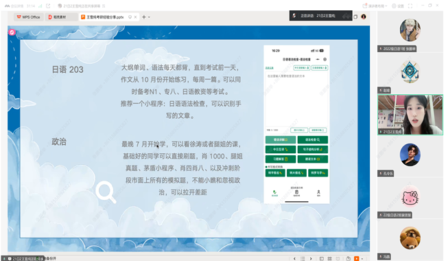5月14日举办的线上考研经验交流会更是为日语系全体师生提供了一个充分展开学术交流的绝好机会。会议邀请了日语专业2021级王雪纯、邢淄沂、孙孟哲、李连良、郝维炜、卢凤雪、孔祥利、迟可心8位考研(或保研)成绩优异的同学结合自己的切身经历为同学们讲述了宝贵的经验。他们对自己的备考经验倾囊相授,从院校选择、复习规划、专业课备考、英语提升以及心态调节等多个方面,为学弟学妹们进行了全面且细致的经验分享。在复习规划环节,学长学姐们详细展示了各阶段的学习时间表,包括每天用于专业课、英语、政治等不同科目的学习时长,帮助同学们合理安排学习进度。专业课方面,他们分享了自己收集整理的优质学习资料、总结出的背诵技巧以及答题技巧,鼓励同学们多做真题、多背诵高质量的范文,提升答题能力。在心态调节上,他们强调保持积极乐观的心态至关重要,要相信自己的努力会有回报,即使遇到困难也不要轻易放弃。交流环节结束后,同学们积极提问,学长学姐们耐心解答,尽管会议长达3个多小时,但全体师生都觉得意犹未尽,低年级的学生们纷纷表示受益匪浅。