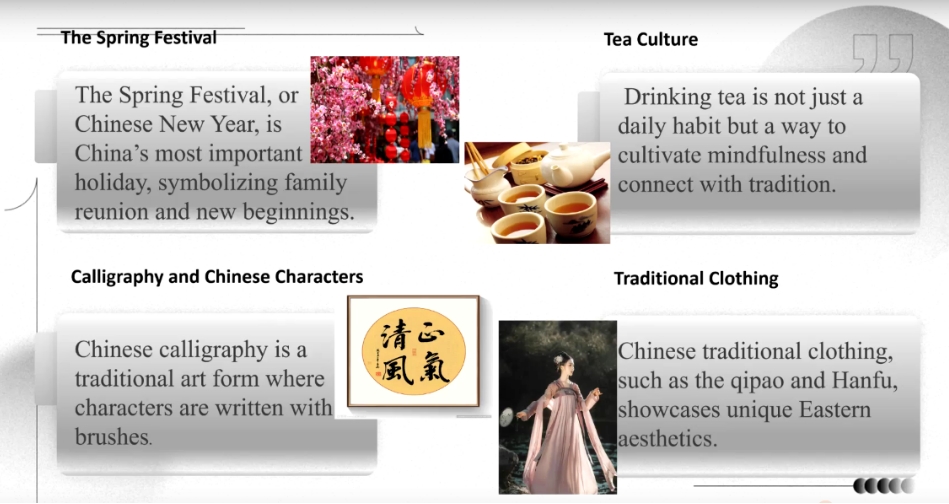 随着交流活动的渐次展开,中墨学子的交流日益深笃。在以 “Cultural Difference” 为主题的交流活动中,ASF学校美籍华裔学生 Joy 以跨文化成长的亲历视角,生动剖白了她眼中的中西文化异同 —— 从餐桌礼仪的细微差别到家庭观念的深层映射,她的分享如同一面多棱镜,折射出东西方文明的独特光谱。2024级英语四班的刘怀钰、李怡璇、邓可可等同学则在此基础上抽丝剥茧,以历史脉络为经、现实案例为纬,深入阐释了中华文化“和而不同、美美与共” 的哲学内核,让在场学生深刻感知到多元文化的璀璨魅力。