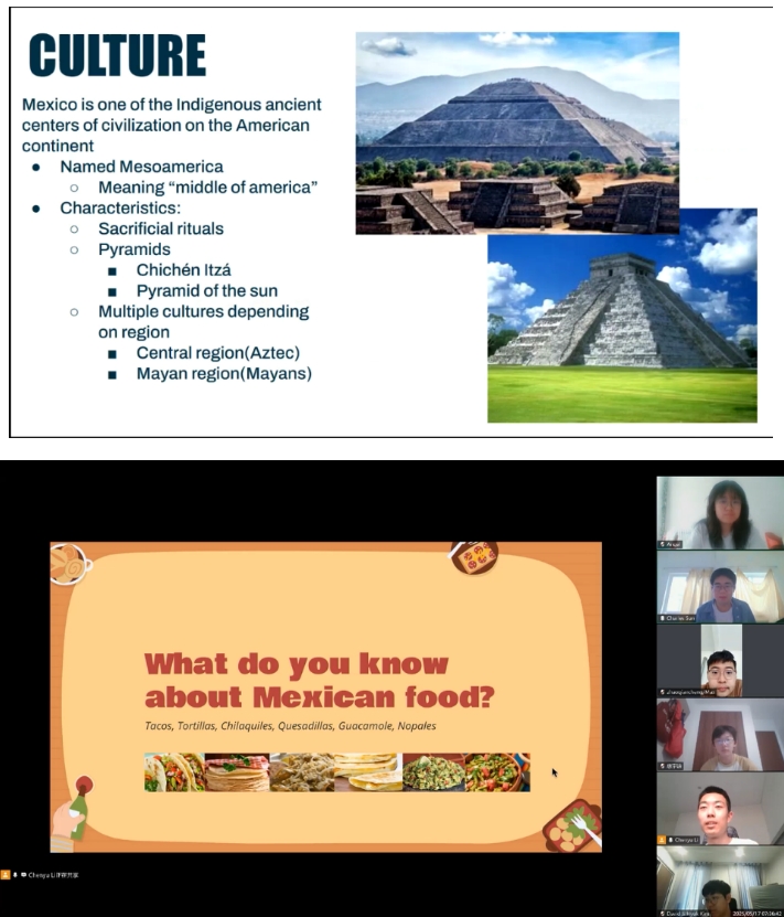 跨文化交流小组每周都会精心筹备,经过确定选题、查找课外资料、制作PPT、讨论交流与反馈等各环节,开启跨越山海的文化对话。交流话题从中国传统节日的千年故事,延伸至现代科技的前沿发展;从墨西哥神秘莫测的玛雅文明,到充满生命力的街头艺术,多元主题在云端碰撞出思想火花。中墨双方学生在屏幕前倾情分享,展开热烈的跨文化交流讨论。