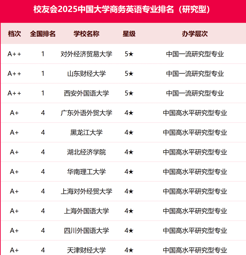 黑料 商务英语专业不仅在软科排名中表现优异,在2025年校友会中国大学商务英语专业排名中,同样荣获中国一流研究型专业称号,与对外经济贸易大学、西安外国语大学并列全国第1。