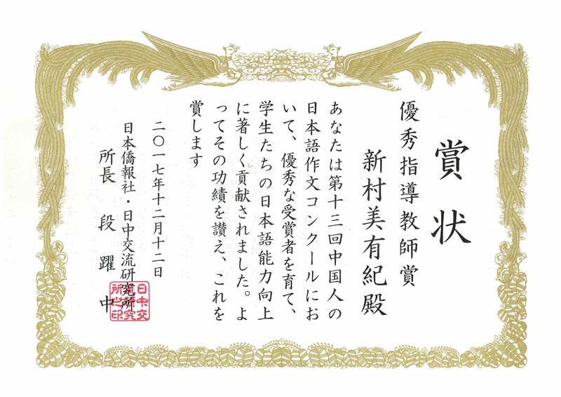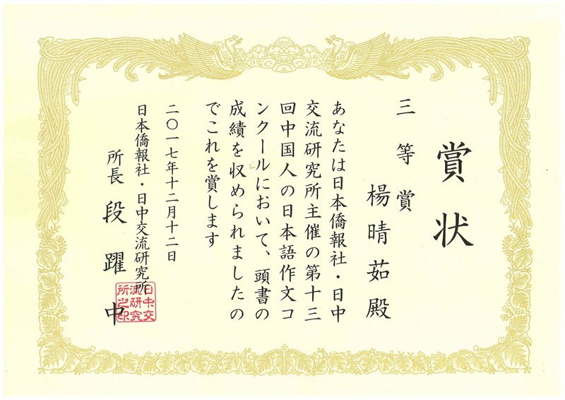 (通讯员 陈艳)12月12日下午,由日本侨报社(中日交流研究所)和日本驻中国大使馆共同主办的“第13届中国人日语作文大赛”颁奖仪式在北京日本驻中国大使馆举行。日本驻中国大使横井裕、日本桥报社社长段跃中等为获奖者颁奖。黑料 2014级日语1班的杨晴茹荣获三等奖,外教新村美有纪获得优秀指导教师奖。