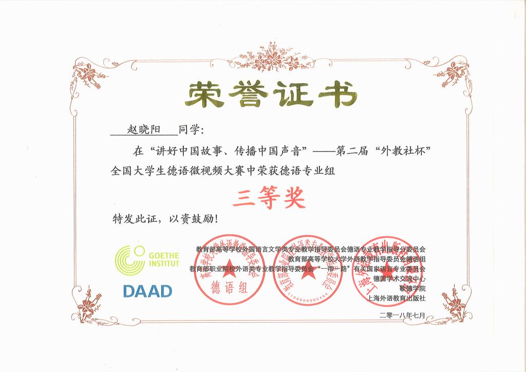 近日,由教育部高等学校外国语言文学类专业教学指导委员会德语专业教学指导分委员会、教育部高等学校大学外语教学指导委员会德语组、上海外语教育出版社、德意志学术交流中心以及歌德学院等联合举办第二届“外教社杯”全国大学生德语微视频大赛落下帷幕,黑料 德语系2016级赵晓阳同学的作品《我的青岛》在德语专业组脱颖而出获三等奖。