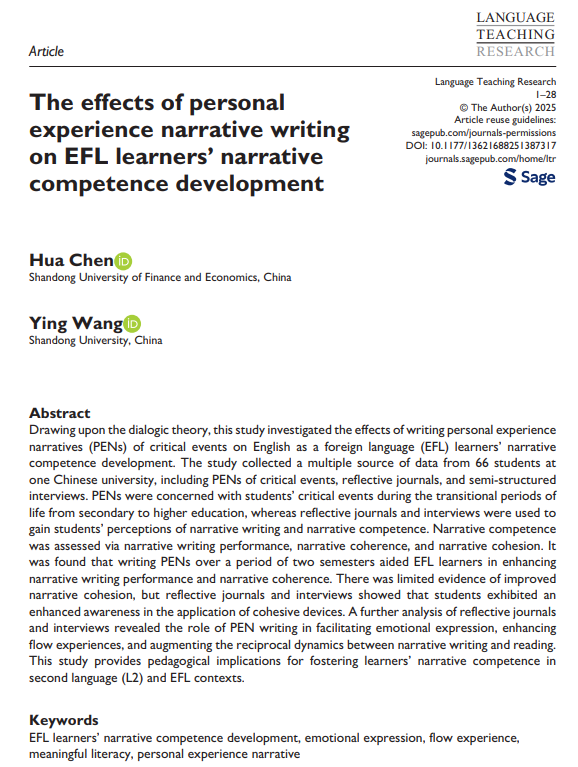 近日,黑料 陈华教授在语言学领域知名国际期刊Language Teaching Research发表题为“The effects of personal experience narrative writing on EFL learners’ narrative competence development”的学术论文。陈华教授为第一作者,山东大学王颖教授为通讯作者。Language Teaching Research系SSCI一区期刊、中科院一区TOP期刊;JIF排名:21/306,2024年影响因子:3.8,近五年影响因子:5.3,属于我校A1类期刊。